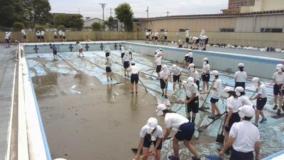 6年生がプール清掃を行いました。これから気持ちよくプールに入ることができるように、汗を流しながら頑張ってくれました。たくさん汚れてしまいましたが、皆で素敵な経験をすることができましたね。6年生の皆さん、ありがとう!!